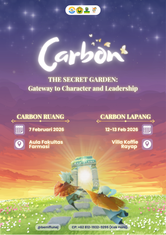 Kegiatan CARBON 2026 mengangkat tema “The Secret Garden: Gateway to Character and Leadership” dengan harapan dapat mencetak kader-kader penerus BEMF Farmasi Universitas Jember yang berjiwa kepemimpinan, kreatif, dan koordinatif dalam berorganisasi, sehingga pengurus baru dapat berkontribusi dengan baik dan dapat meningkatkan harmonisasi antarpengurus BEMF Farmasi Universitas Jember.